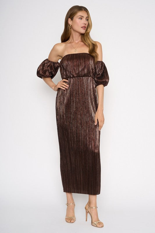 Metallic Brown Off Shoulder Midi Dress