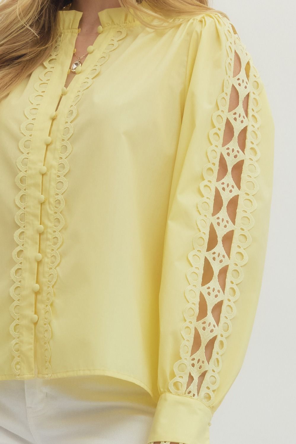 Solid long sleeve top featuring scallop accent trim along front and sleeves with cutout lace detail. Button closure at front and cuffs. Unlined. Woven. Non-sheer. Lightweight.