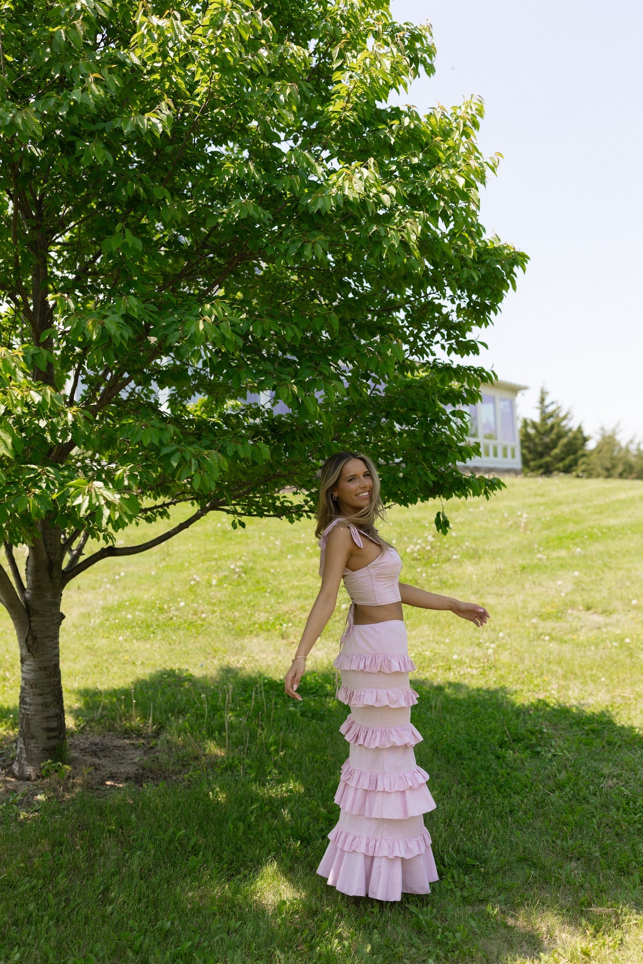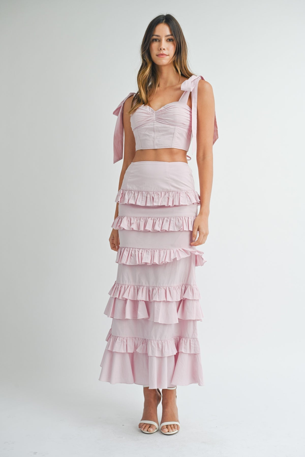 SET - The cropped top features a sweetheart neckline, while tie-close shoulder straps add a dash of youthful charm. Turn around to reveal a captivating back corset lace-up feature that's sure to turn heads. The set's high-waisted midi skirt cascades down in a drop tiered A-line design adorned with playful ruffles.