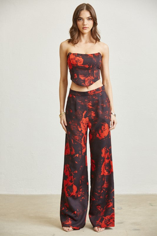 Corset strapless adjustable top with lace-up back paired with the high waist wide leg pant rose print set.