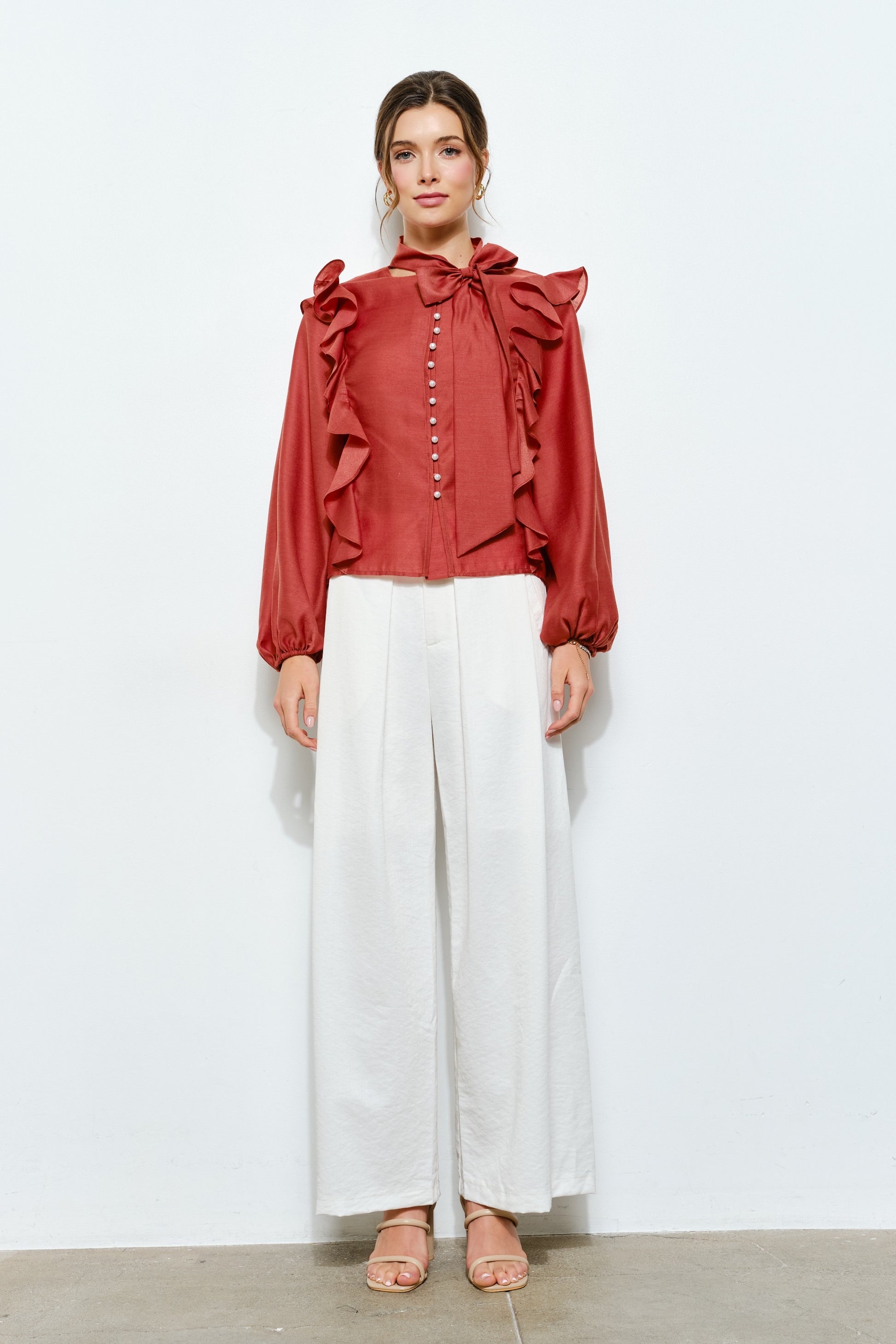 Soft Wool Bow Tie & Pearl Buttons Blouse